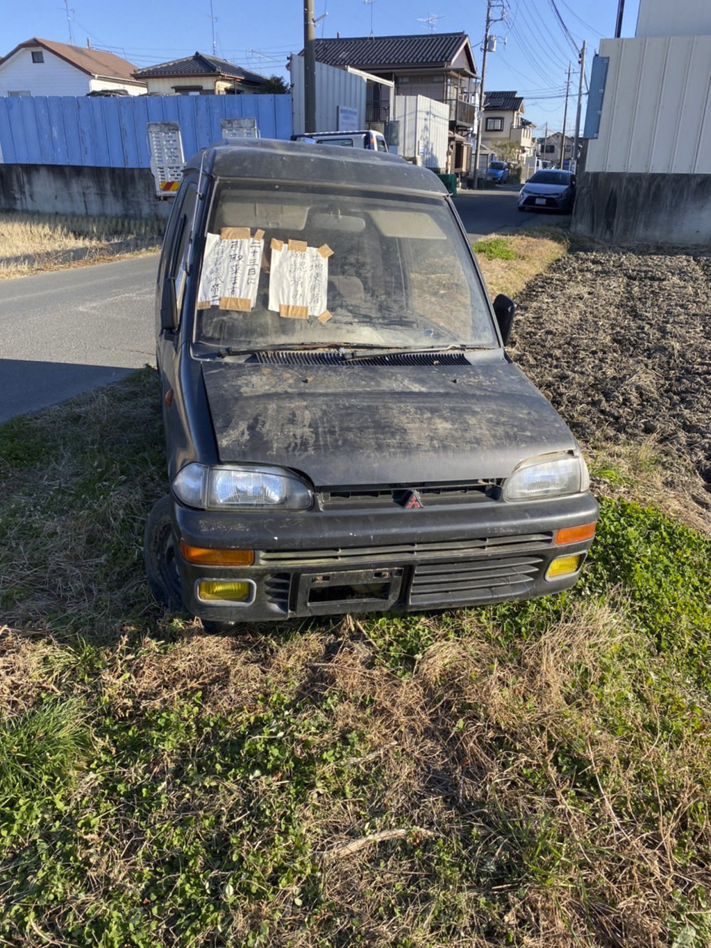 路床端にて放置された三菱の軽自動車、周囲の車通りが少なくトラックを止めての作業が可能だった為引取致しました。特別案件の為買取不可。